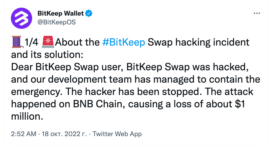 В BitKeep подтвердили взлом 18 октября, добавив, что команда разработчиков сумела сдержать чрезвычайную ситуацию. Взлом произошел в сети BNB Chain. Ранее в этом месяце хакеры уже взламывали этот блокчейн. Тогда им удалось вывести $100 млн.