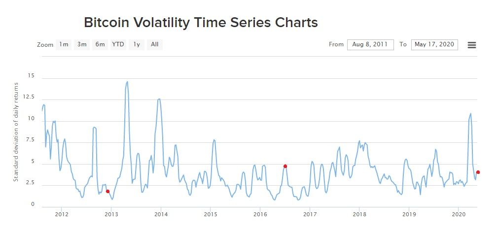 После первого халвинга 2012 года волатильность снижалась первое время, а потом заметно выросла. Та же тенденция наблюдалась после второго халвинга: снижение происходило до резкого роста цены в декабре 2017 года. Что же касается влияния третьего уменьшения награды за добычу блока, пока мы наблюдаем повышение уровня волатильности. Если до 11 мая значение составляло 3,05%, то по состоянию на 17 мая этот показатель равен 4,01%.