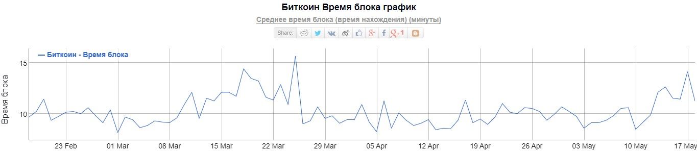 Халвинг также повлиял и на время добычи одного блока. Сразу после события аналитики передавали, что время добычи снизилось до 7 минут. Хотим отметить, что обычно данный показатель находится на уровне 10 минут. Так, по состоянию на 9 мая, время добычи нового блока составляло 8,47 мин. После неожиданного снижения показатель вырос на 65% по состоянию на 17 мая. Сейчас мы снова наблюдаем снижение времени добычи блока: на 18 мая оно упало до 11,25 минут.