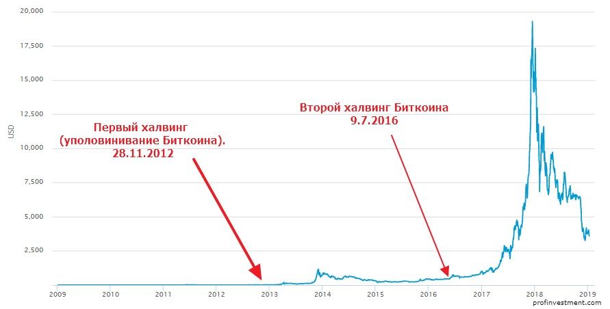 До сокращения награды в 2012 году цена за одну монету составляла $12.12. При этом за год она выросла до $988.63 (+8057%). К моменту второго халвинга в 2016 году цена за один BTC составляла $657.56. В июле 2017 года она повысилась до $2,525 (+283%). В декабре этого же года цена биткоина достигла исторического максимума и составила $19,783 за одну монету. Таким образом, после второго халвинга биткоина стоимость актива возросла на 2908% за 1,5 года.