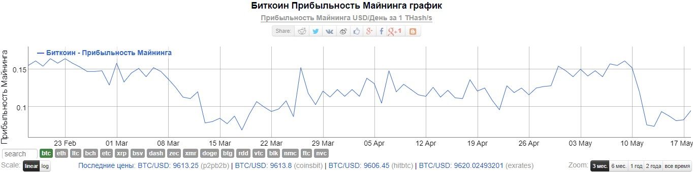 График показывает, что с момента третьего халвинга прибыльность майнинга существенно снизилась. Если на 9 мая этот показатель был 0,161 (USD/день за 1 THash/s), то на 19 мая он снизился до 0,095.