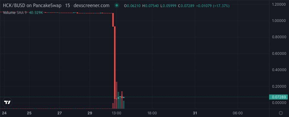 SponsoredПо опубликованным данным, адрес 0x6E…A441 в блокчейн-сети BNB Chain (бывш. Binance Smart Chain) за пару часов слил несколько сотен тысяч токенов hero cat key (HCK) в обмен на стейблкоин binance usd (BUSD) через децентрализованный обменник PancakeSwap V2.