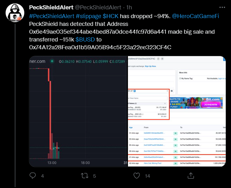 Проект HeroCatGameFi заподозрили в мошенничестве на фоне обвала курса нативного токена HCK. Первыми на это обратили внимание аналитики PeckShield, которые зафиксировали крупный отток капитала из проекта.