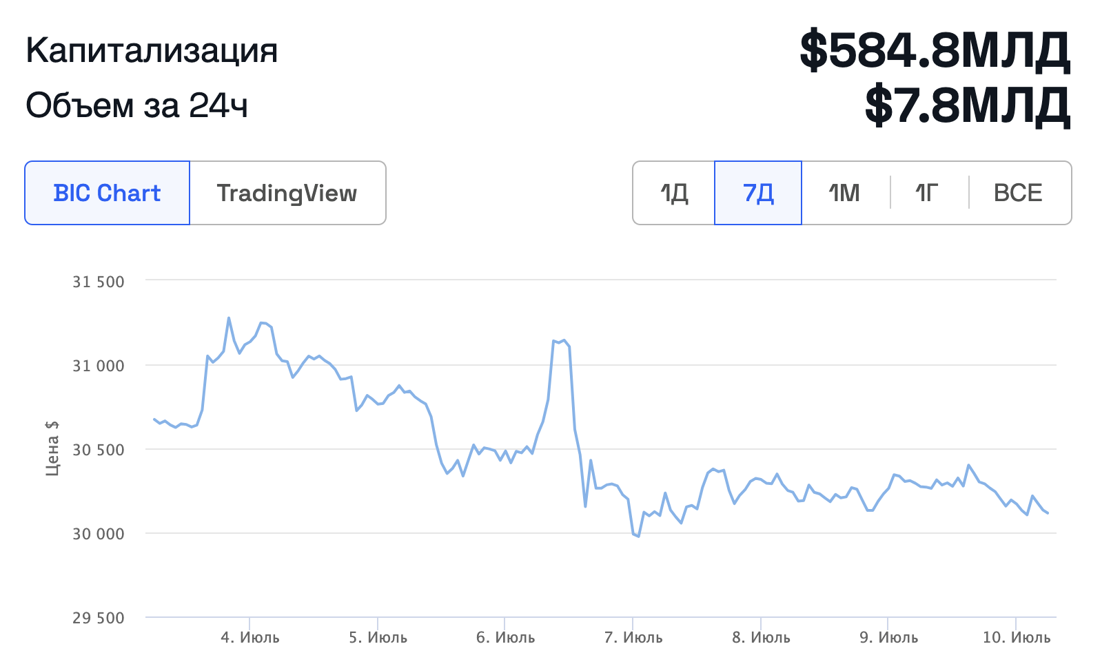 На выходных курс биткоина держался чуть выше $30 000. На момент публикации BTC торгуется на уровне $30 155 с незначительным понижением.