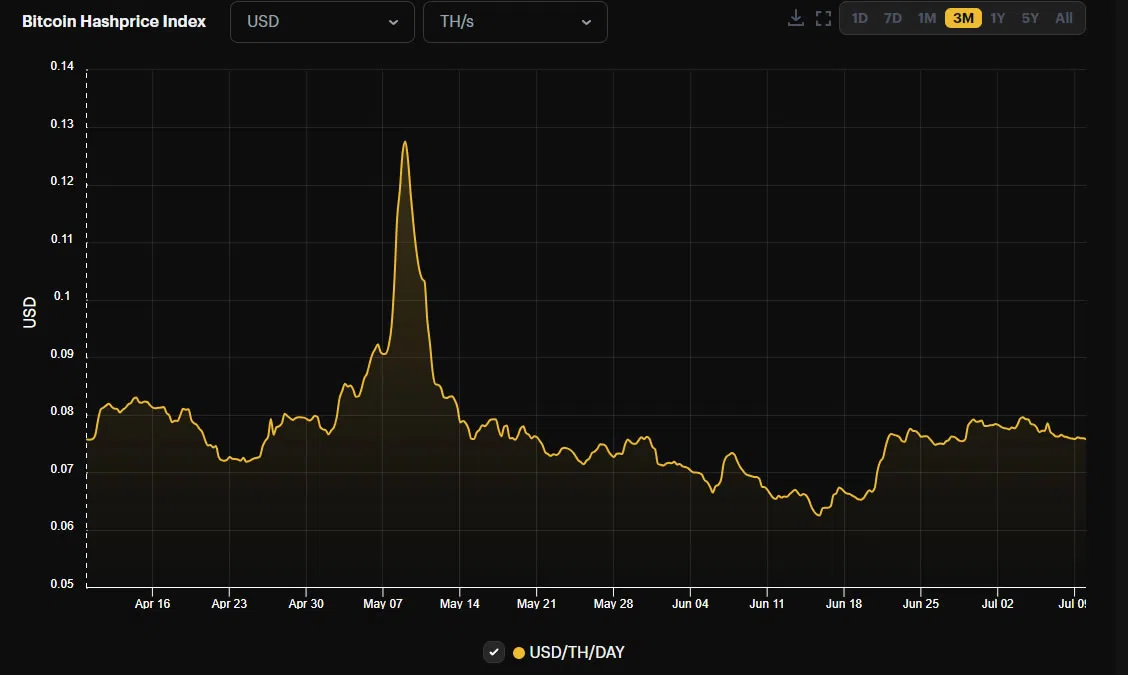 Давление на майнеров биткоина усилится из-за падения стоимости хэшрейта. Этот показатель сейчас составляет $0,075 за TH/день и отражает прибыль, которую могут получить майнеры. В начале мая, когда рынок увлекся майнингом ординалов, стоимость хэшрейта выросла до $0,127, что привело к сильной перегрузке сети.