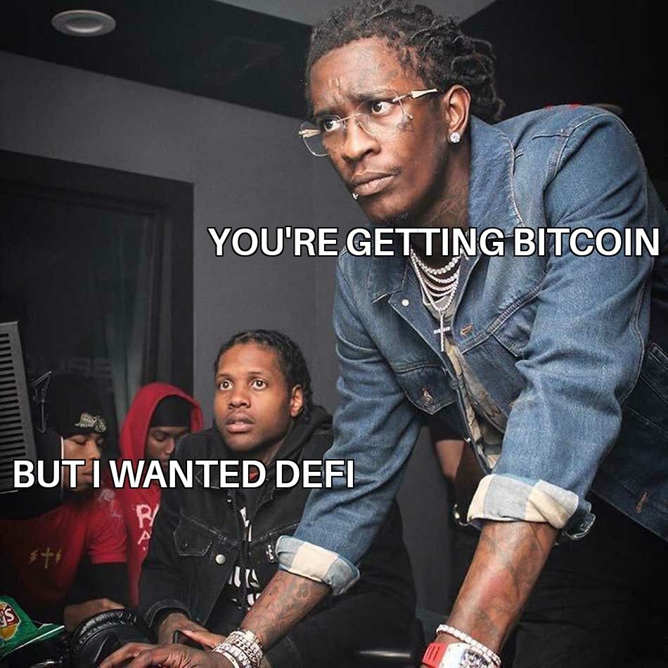 Не обошлось без очередной порции шуток о DeFi. В глазах многих представителей криптоиндустрии, инвестиции в проекты сектора децентрализованных финансов выглядят глупо. При этом выбор биткоина в качестве актива для вложения средств участники рынка считают зрелым, взвешенным решением.