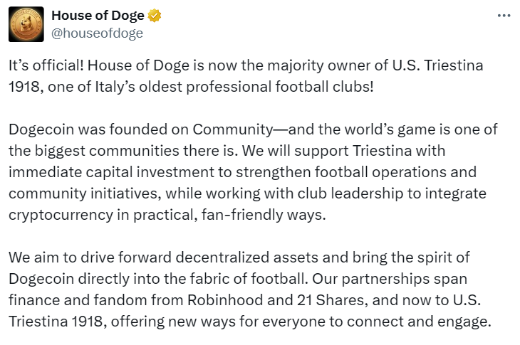 «Наше вложение — это способ доказать, что цифровые активы способны создавать реальную ценность, культуру и эмоции. Футбол — идеальная площадка чтобы показать, как децентрализованные сообщества могут приносить устойчивые результаты», — заявил Марко Марджиотта, генеральный директор House of Doge.