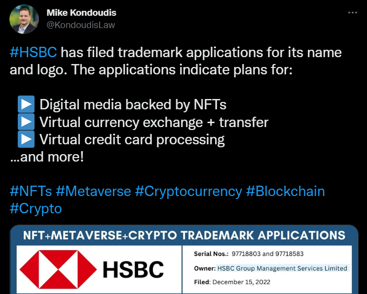 Британский финансовый институт HSBC зарегистрировал торговые марки на NFT-маркетплейс и метавселенную. Об этом у себя на странице в твиттере сообщил патентный поверенный Майк Кондудис. Согласно описанию торговых марок, банк зарегистрировал торговые марки в Ведомстве по товарным знакам и патентам США еще 15 декабря.