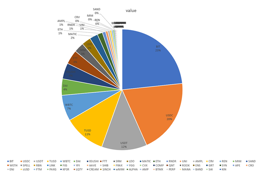 Также под угрозой оказались токены проектов, в которые вложилась Alameda Research — аффилированная с FTX торговая фирма. В отслеживаемых кошельках Alameda больше всего хранит токены биржи Bybit (BIT), где на его долю приходится 23% от всего портфеля. На втором месте оказался стейблкоин от Circle под названием USD coin (USDC) с 20%. Тройку закрыл стейблкоин от Tether — USDT с 12%.