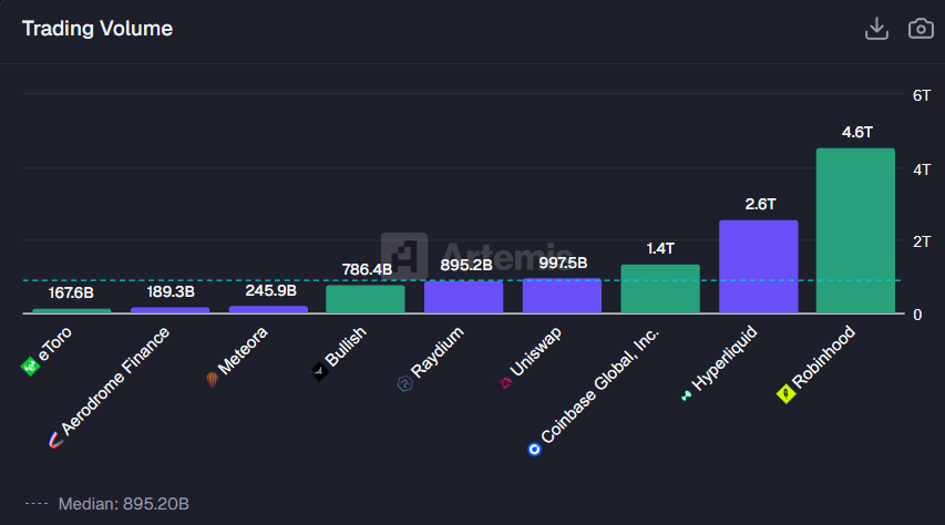 Средства пользователей Hyperliquid хранятся в смарт-контрактах, а не на балансе компании, поэтому прямого сравнения здесь нет. Метрика отражает институциональный вес Coinbase, но не ее позиции в трейдинге.