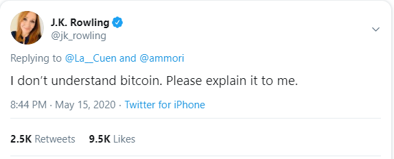 Некоторые авторы комментариев попытались объяснить суть биткоина языком романов самой Роулинг. Так, пользователь под ником @keeskoenen написал, что ВТС, как волшебная палочка Гарри Поттера, а с точки зрения конфиденциальности надежнее, чем «плащ-невидимка». Также пользователь сравнил майнеров с «гоблинами, которые распоряжаются палочками для волшебников и продают их в своих магазинах». В целом читатели Twitter дали огромное количество информации, которая наверняка поможет Роулинг разобраться в схеме действия биткоина. Но один из ответов заинтересовал публику и журналистов больше всего.