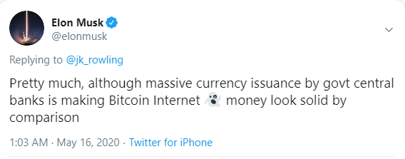 В комментариях под постом Роулинг появилась и запись от Илона Маска, в которой он написал, что «массовая эмиссия фиатных денег центральными банками стран делает биткоин более стабильным на рынке».