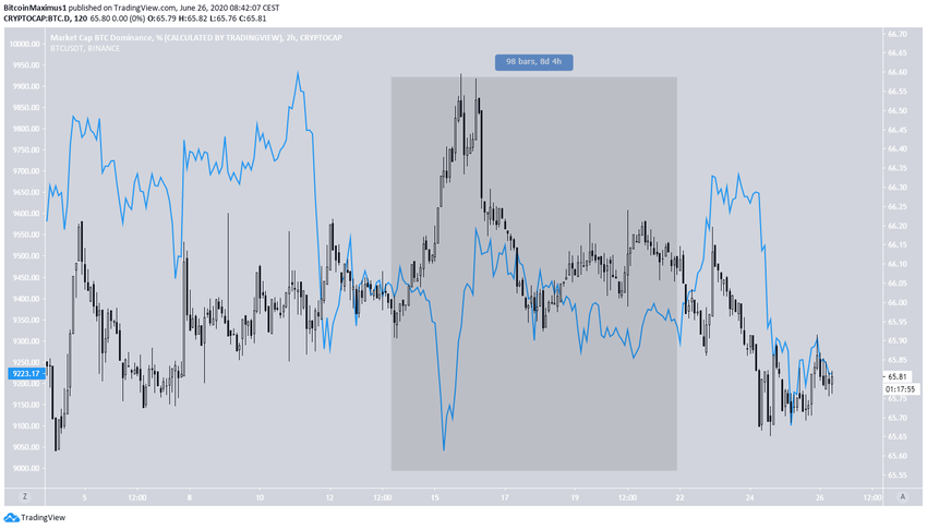 Что касается текущей корреляции индекса BTCD с биткоином, то, как мы уже отмечали ранее, в июне между ними наблюдаются сложные отношения. В период с 5 июня два этих показателя демонстрировали прямую корреляцию – рост одного из них обуславливал повышение другого. Однако на протяжении 8-ми дней, с 13 по 21 июня, отмечалась прямо противоположная ситуация: падение курса ВТС провоцировало рост индекса доминирования биткоина.