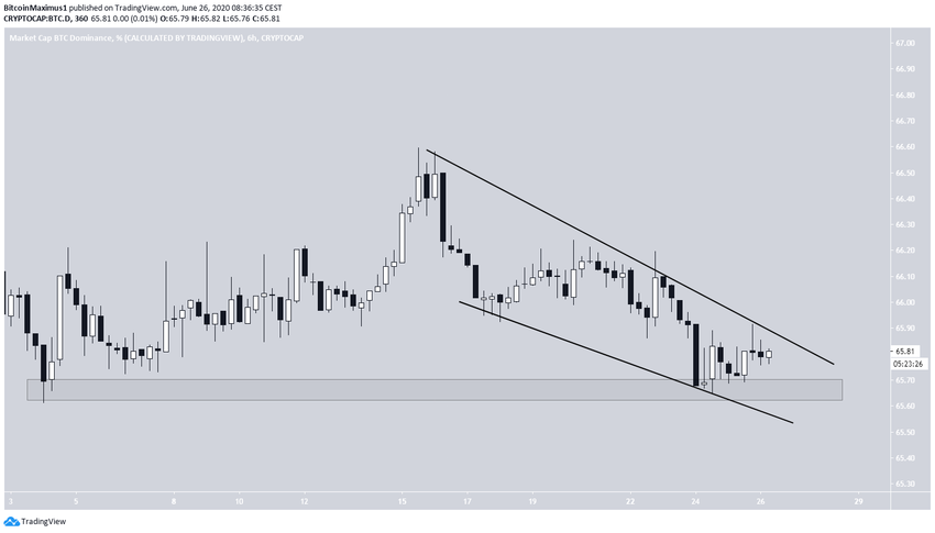 На более краткосрочном графике BTCD торгуется внутри либо нисходящего канала, либо клина. Кроме того, индекс отскочил от области незначительной поддержки 65.5%, которая позволила рынку запустить рост 4 июня.