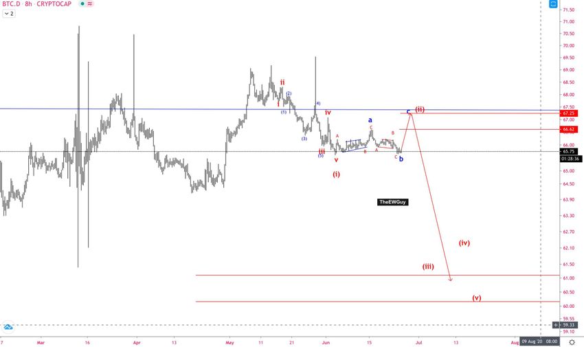 Популярный трейдер @TheEWguy, специализирующийся на техническом анализе с использованием волн Эллиотта, предположил, что индекс доминирования биткоина может предпринять один прощальный рывок на север, а затем существенно снизиться: