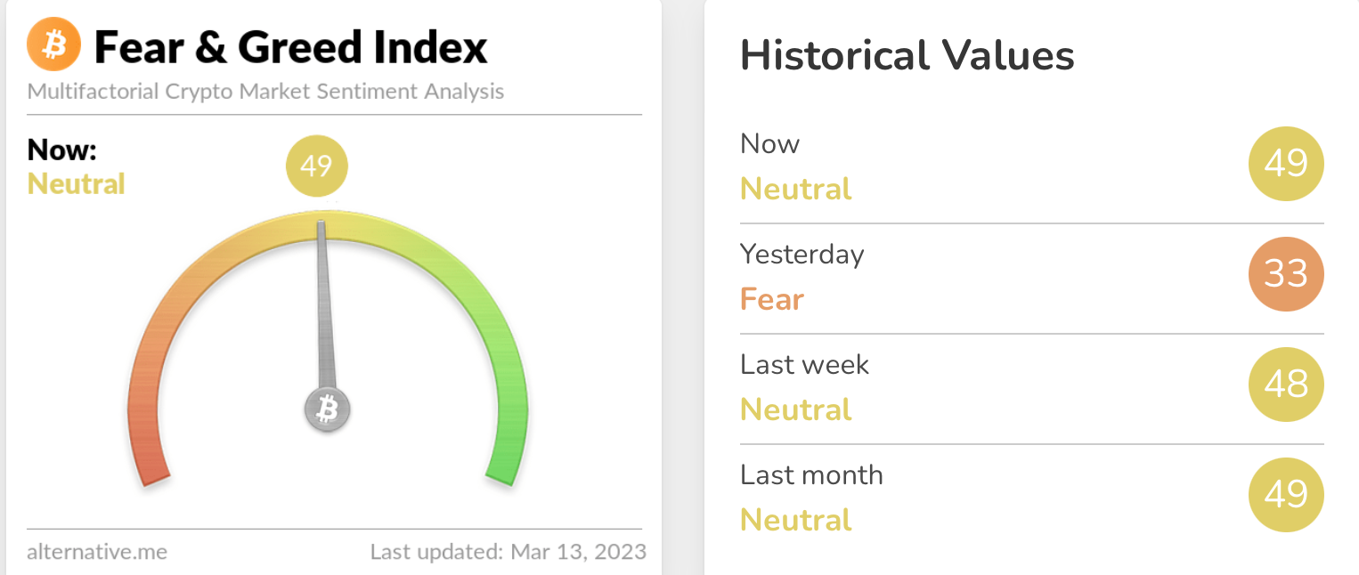 Помимо этого, в воскресенье, 12 марта, крипторынок потрясла новость о закрытии банка Signature. В результате индекс страха и жадности снизился до отметки в 33 несмотря на то, что всю неделю индекс находился на уровне 48 пунктов.