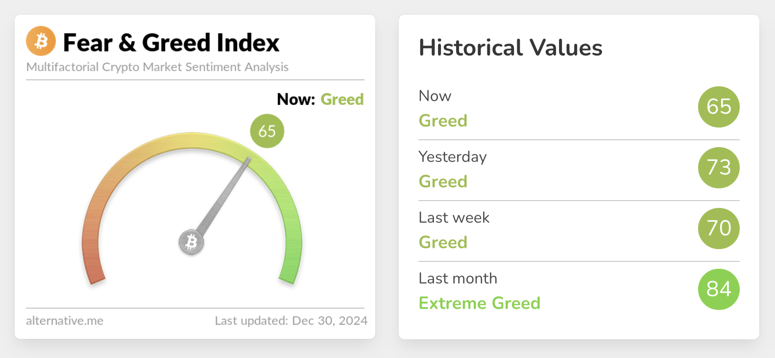 По данным Alternative.me, сейчас показатель индекса страха и жадности составляет 65. Стрелочка находится в зоне «жадности». В последний раз значение метрики опускалось ниже 70 только в октябре. ALternative.m