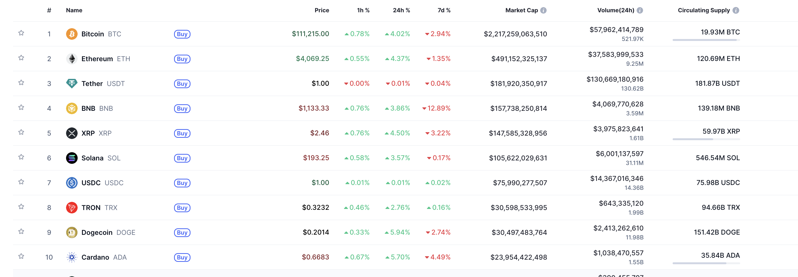 По данным CoinMarketCap, на момент написания биткоин торгуется по $111 215. За сутки главная криптовалюта укрепилась на 4%, однако в недельном соотношении она все еще остается в минусе на 2,94%.