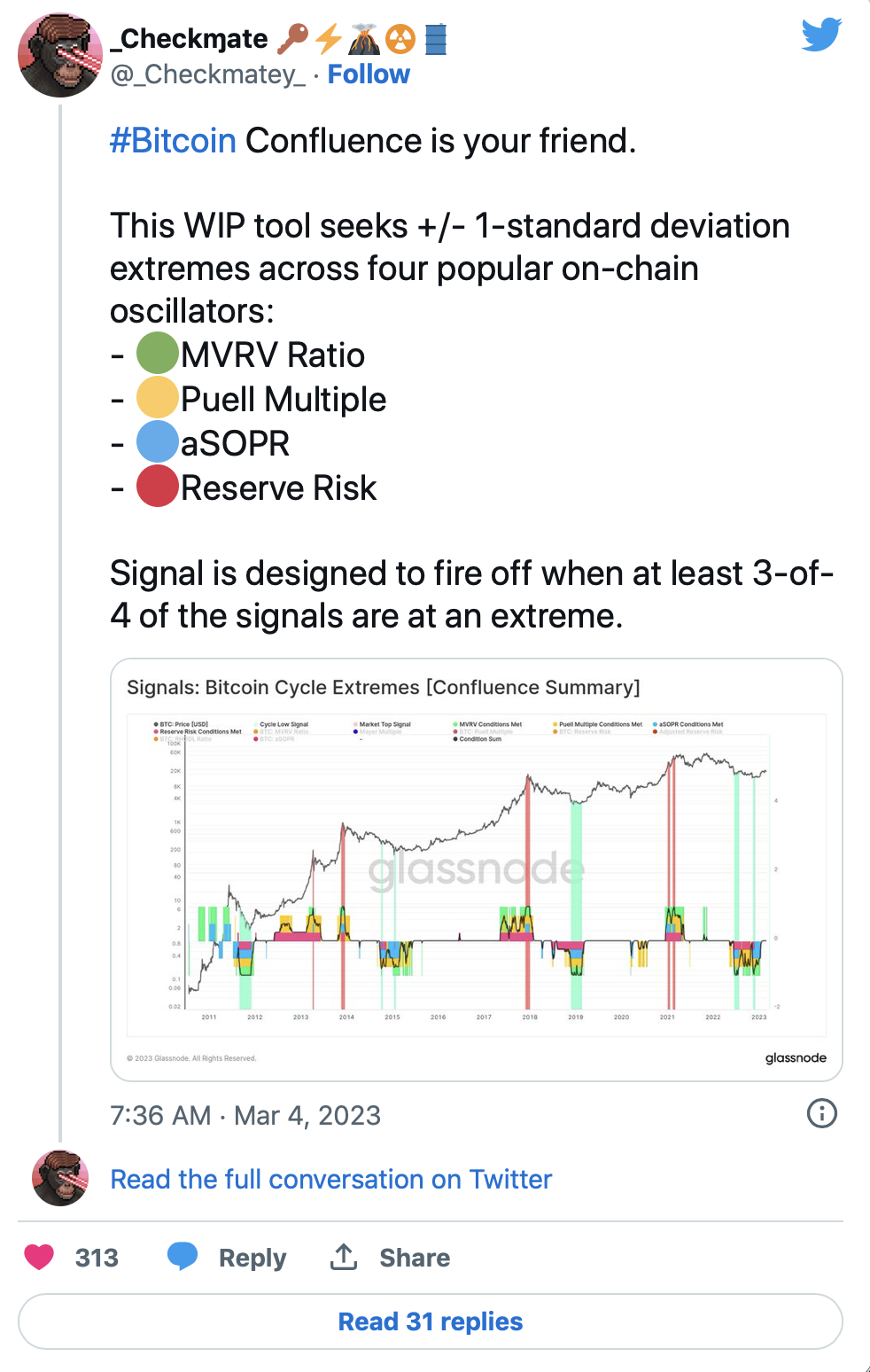 Новый индикатор от Glassnode учитывает четыре наиболее популярные метрики, которые исторически показали высокую точность в определении пиков и минимумов циклов BTC. Он измеряет стандартное отклонение от экстремумов следующих осцилляторов: