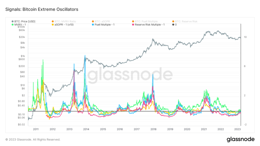 На графике видно, что экстремумы продолжающегося медвежьего рынка появились в середине июня 2022 года и исчезли в начале 2023 года вместе с ростом цены биткоина до $25 000. Стоит отметить, что недавнее падение ниже $20 000 не сформировало нового сигнала.