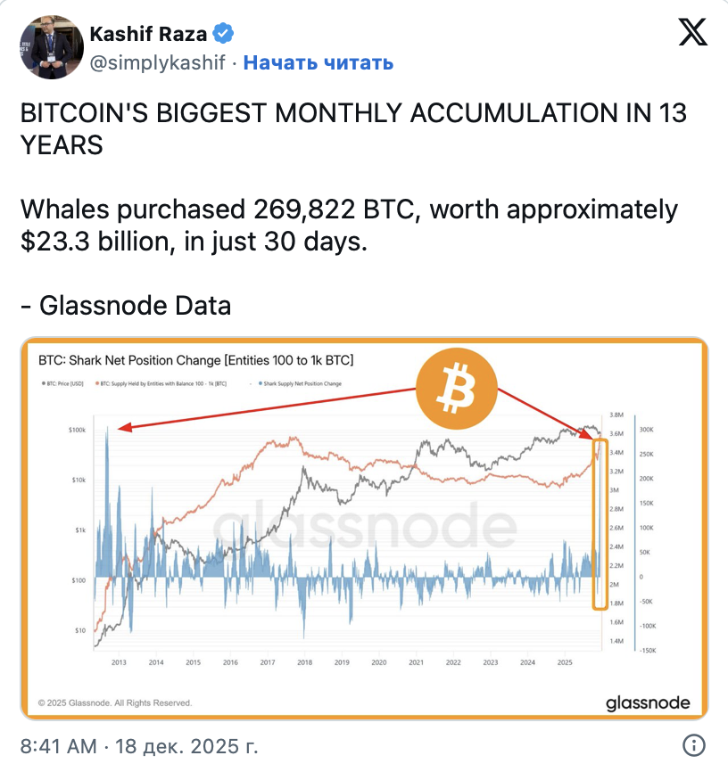 Сигнал о недооцененности актива сопровождается беспрецедентной активностью крупных участников рынка. За последние 30 дней крупные инвесторы приобрели 269 822 биткоина на сумму около $23,3 млрд. По данным аналитической платформы Glassnode, это крупнейший объем месячных покупок с 2011 года.