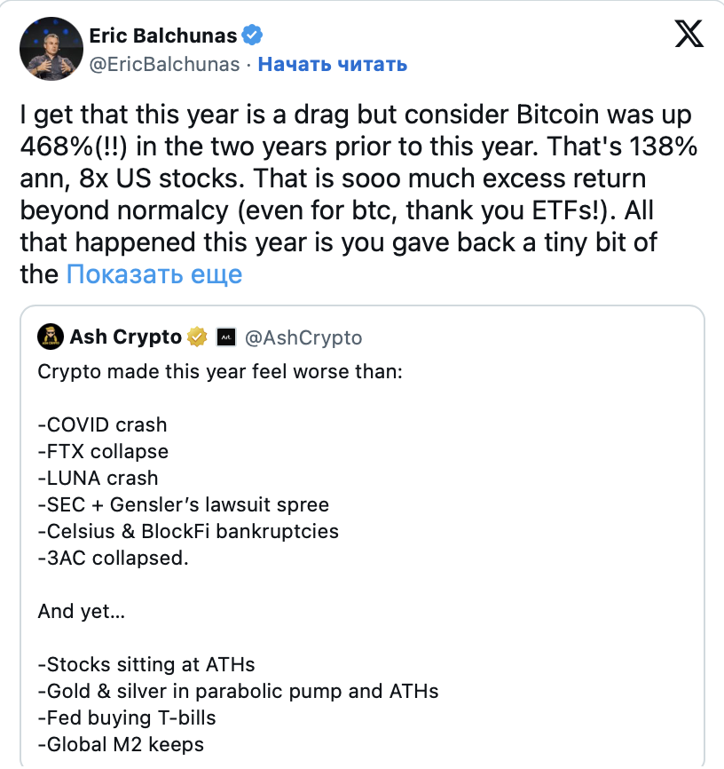 «Мы больше не боимся, мы устали. Устали ждать и верить. Однако помните: рост не начинается на пике надежды. Он происходит тогда, когда люди разочарованы и готовы сдаться», — написал аналитик Ash Crypto.