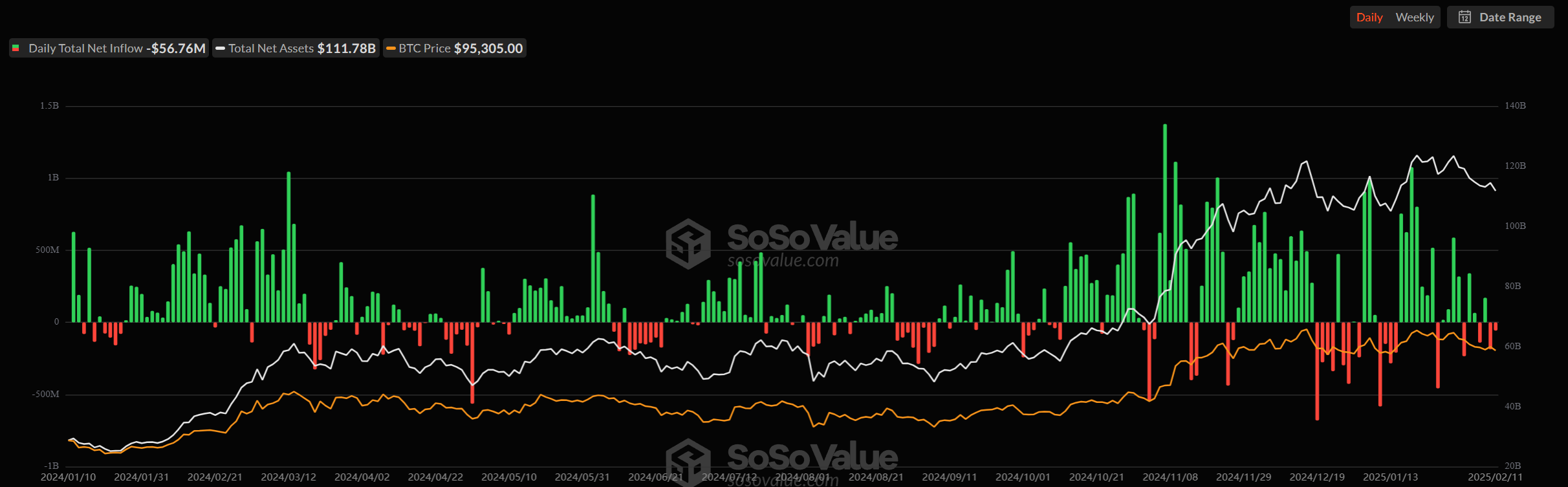 По итогам последней торговой сессии из спотовых биткоин-ETF вывели $56,76 млн. Общий отток с начала этой недели достиг $243 млн.