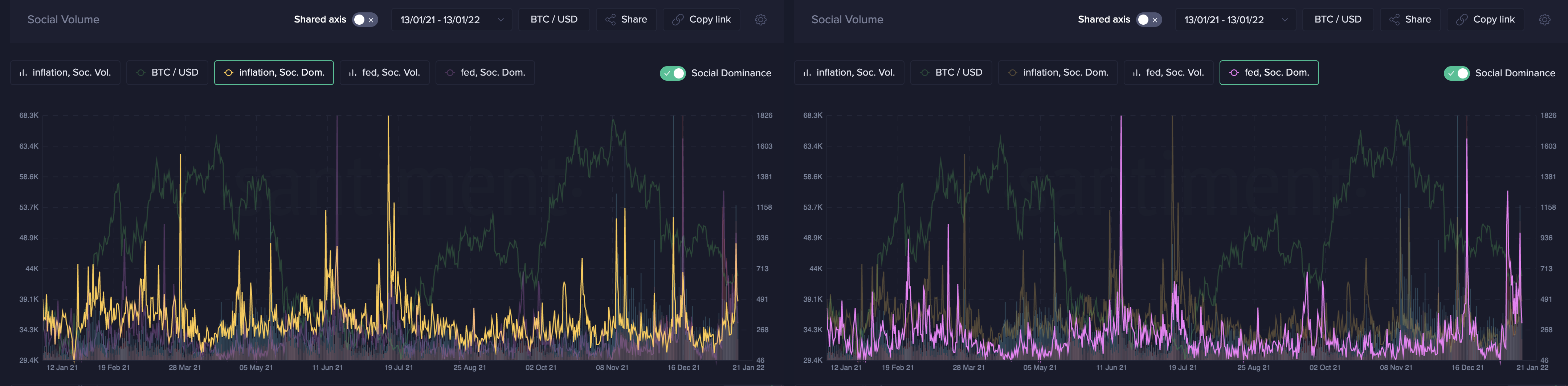 Разговоры в социальных сетях об инфляции и политике ФРС США активно растут по мере падения цены биткоина. На это обратили внимание аналитики ресурса Santiment. По опубликованным данным, социальная активность вокруг темы инфляции коррелирует с действиями ФРС.