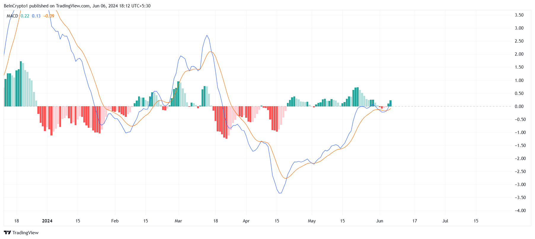 Технический индикатор MACD также намекает на возможное начало ралли. В настоящее время он демонстрирует бычье пересечение. Обычно появление этого сигнала на графике предшествует росту.