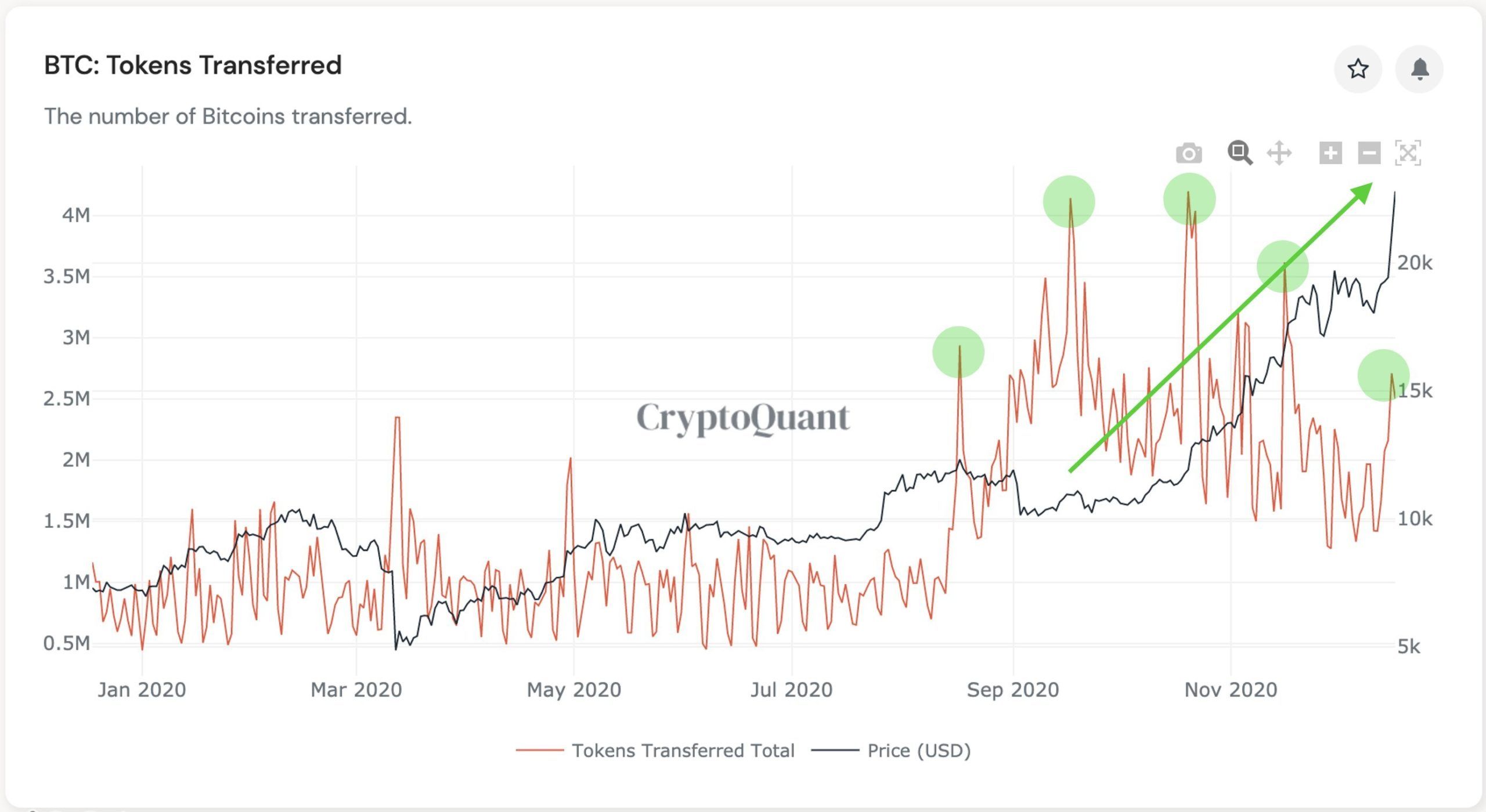 Для слежки за внебиржевыми сделками глава CryptoQuant рекомендует приглядывать за показателем перемещаемых токенов по сети. Если число перемещенных токенов растет, а коэффициент потока биржевых средств остается неименным или падает, это означает о продолжении внебиржевых сделок.