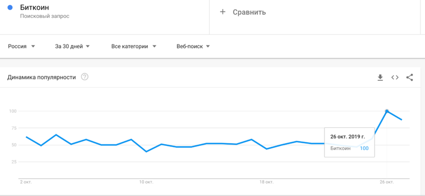 Интерес российских пользователей интернета к биткоину и другим криптовалютным активам существенно вырос в конце октября. Об этом свидетельствуют данные аналитического ресурса Google Trends. Индекс популярности запросов с ключевым словом «биткоин» достиг июльских максимумов, удвоившись относительно значений, зафиксированных на начало октября.