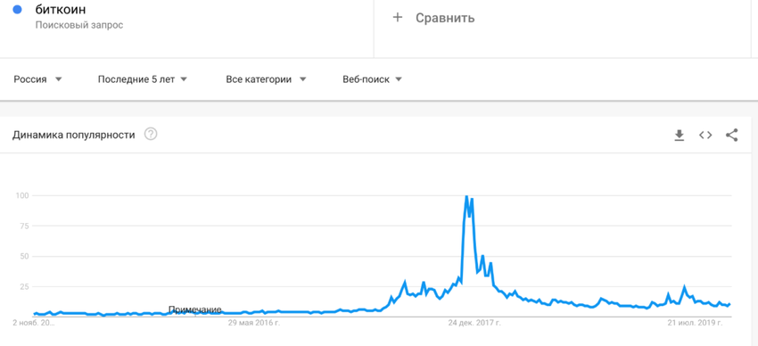 Прямую корреляцию между динамикой запросов с волатильностью криптовалютного рынка доказывает угасание поисковой активности после стабилизации ситуации на рынке. Между тем на сегодняшний день интерес к биткоину все равно не дотягивает до уровней, зафиксированных в июле этого года, и не превышает 10% от пиковых значений, достигнутых в конце 2017 года, когда один биткоин стоил около $20 000.