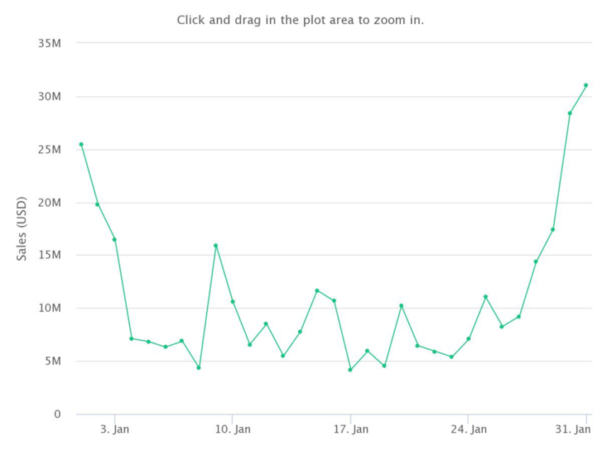 В январе 2022 года объемы продаж Axie Infinity и Mutant Ape Yacht Club составили примерно $126,49 млн и $252,33 млн соответственно.