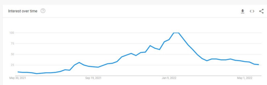 Термин «невзаимозаменяемый токен» достиг значения 26 в последние дни мая – снизился на 74% по сравнению с максимально достигнутым значением в 100, зафиксированным в январе 2022 года.