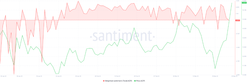 Кроме того, сейчас альткоин получает значительную поддержку со стороны инвесторов, которые, несмотря на ралли, по-прежнему оптимистично настроены в отношении дальнейшего роста цены. Об этом свидетельствуют взвешенные настроения держателей ICP, которые на момент написания статьи демонстрируют бычий настрой.