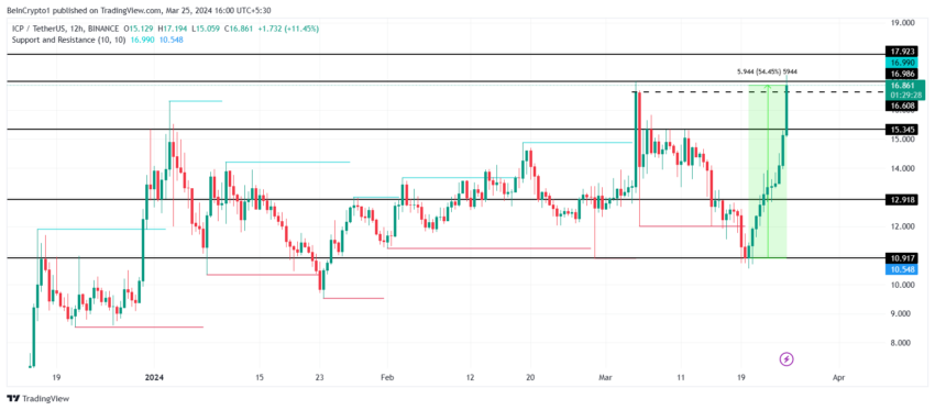 За последние несколько дней цена Internet Computer выросла на 54,45%, достигнув отметки $17. Таким образом, альткоин уже оправдал недавний прогноз BeInCrypto, в котором ожидалось ралли до $15 до конца месяца.