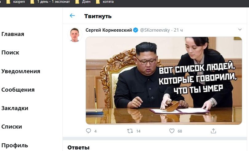 К примеру, пользователь Twitter Сергей Корнеевский разместил пост, на котором вождь корейцев сидит за столом, а его сестра Ким Ё Чжон подает папку с документами. Надпись гласит: «Вот список тех, кто говорил о твоей смерти». Подтекст гласит, что Ын строго расправится с теми, кто распространял слухи о его кончине.