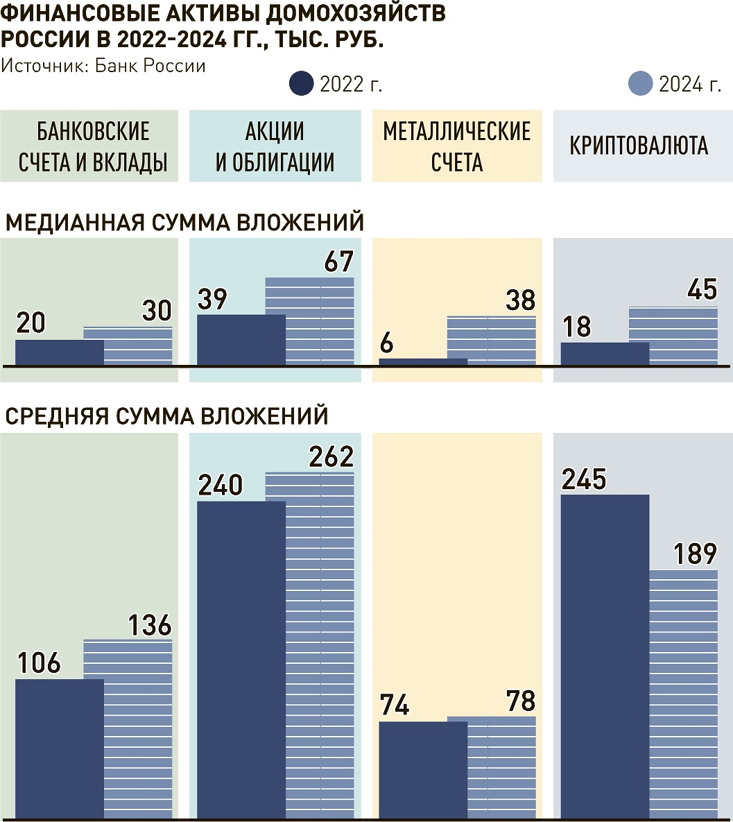 По данным ЦБ, в 2022 году медианный размер вложений на домохозяйство (лицо или группа лиц, живущих вместе и ведущих совместное хозяйство) составлял 18 тыс. рублей. К 2024 году эта сумма увеличилась втрое — до 45 тыс. рублей.