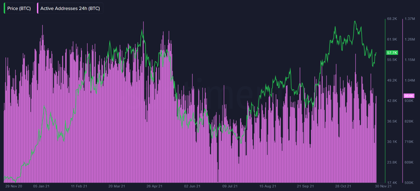 Достигнув пика в 1,19 млн адресов 9 ноября, ежедневные активные биткоин-адреса обрушились уже на 17%. Это, как полагают в Santiment, свидетельствует о возможном переходе некоторых инвесторов «в режим бездействия». Аналитики предупреждают, что апатия инвесторов в конечном итоге может помешать быстрому откату цены криптовалюты в краткосрочной перспективе.