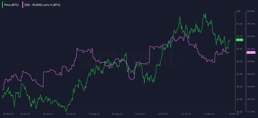 Впрочем, в сети по-прежнему есть группа адресов, покупающих криптовалюту при любой просадке цены. Например, кошельки с объемами биткоина от 100 до 10 000 BTC за последние две недели увеличили резервы на 50 000 BTC. Столь крупная закупка может сигнализировать о тренде аккумулирования, полагают в Santiment.