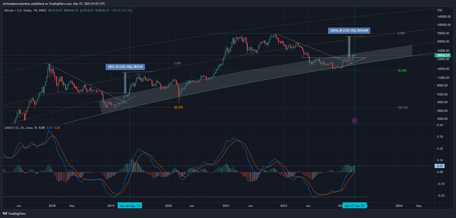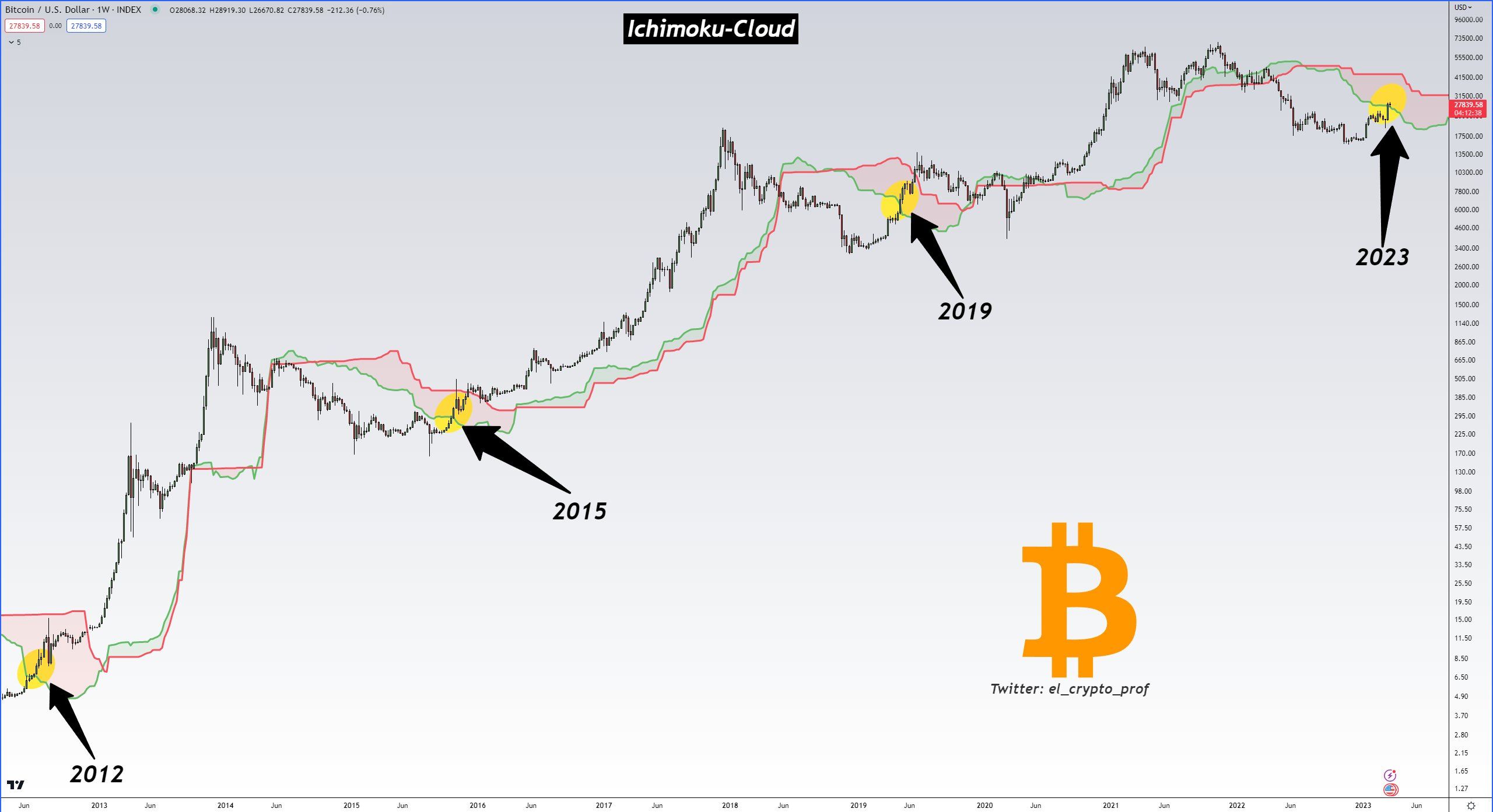 Блогер @el_crypto_prof, в свою очередь, увидел потенциал роста BTC в поведении индикатора Ишимоку.