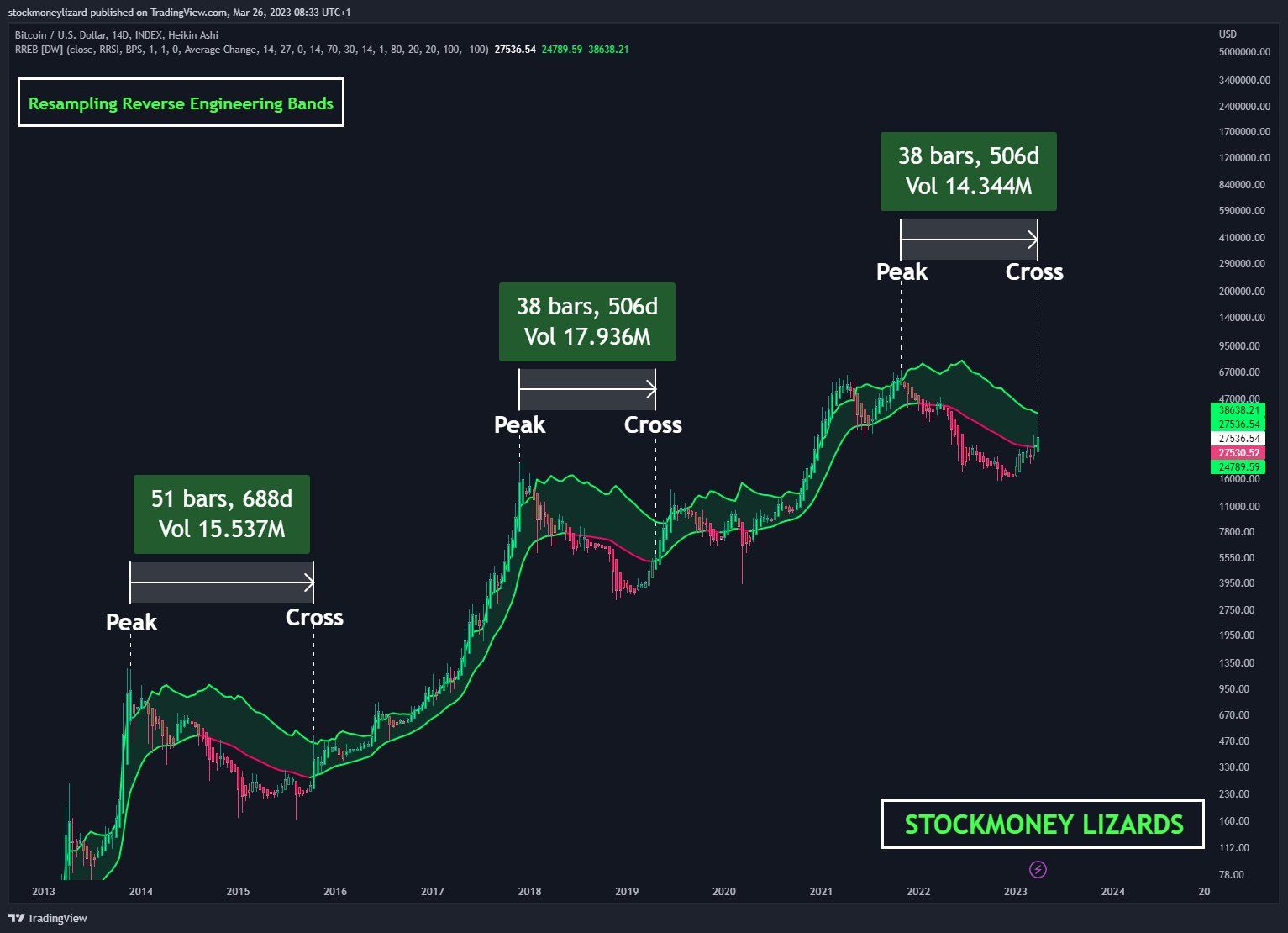 Среди других доводов в пользу роста криптовалюты – исчерпание сил медведей. Трейдеры обращают внимание на позитивные сигналы различных метрик. Например, блогер Stockmoney Lizards отметил сигналы индикатора Resampling Reverse Engineering Bands [DW], которые указывают на потенциал роста криптовалюты.