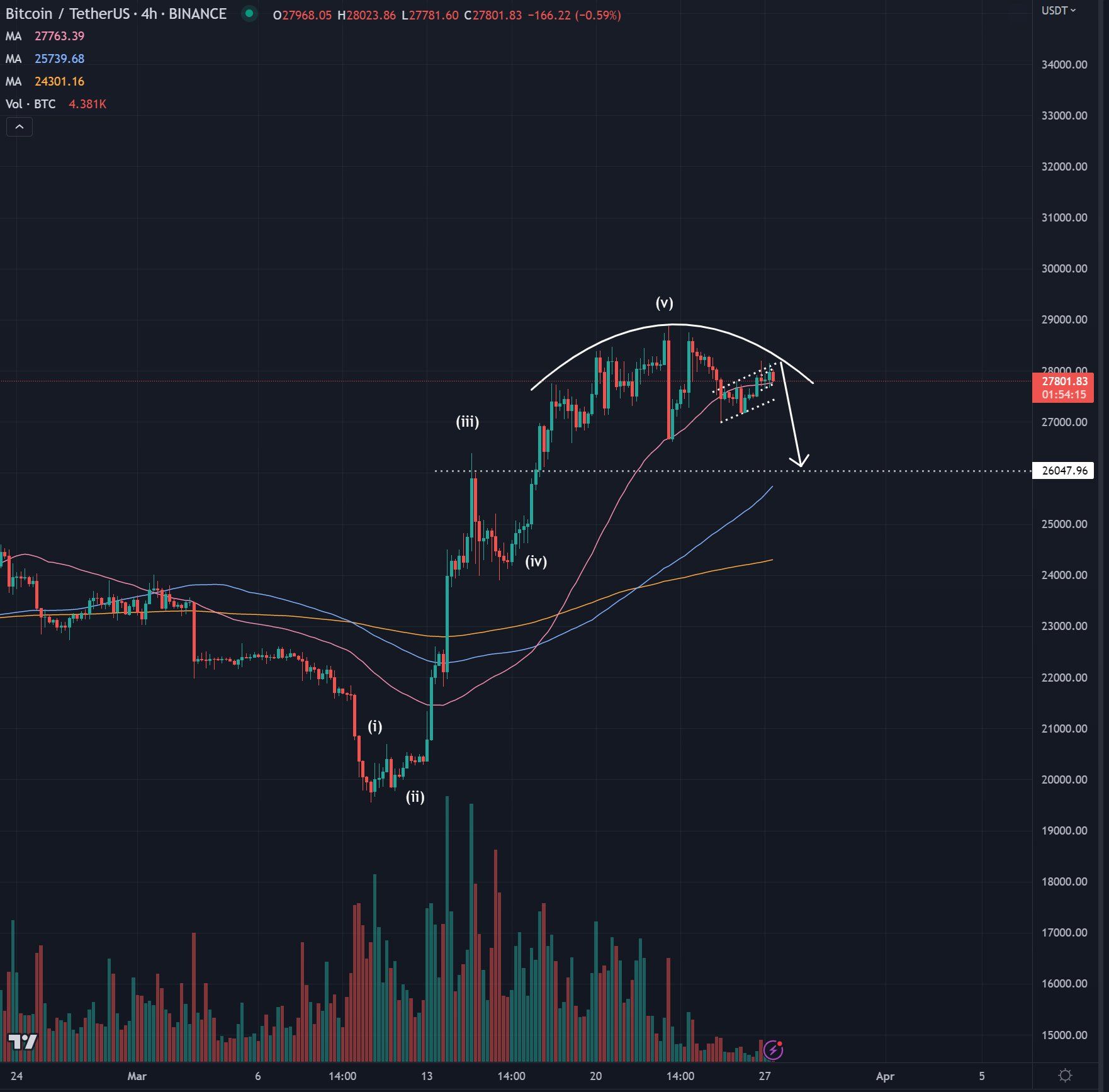 Потенциал коррекции биткоина также видит криптоблогер Bluntz. По его мнению, техническая картина указывает на возможность спуска BTC к $26 тыс.