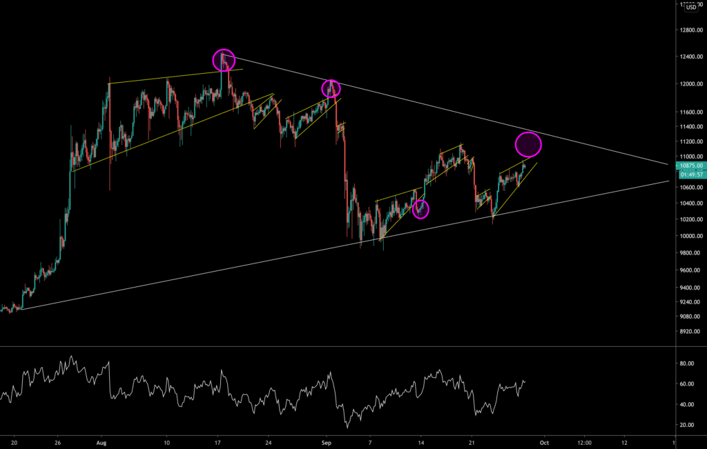 Некоторые трейдеры считают, что в настоящий момент криптовалюта движется в рамках сужающегося треугольника. Согласно правилам технического анализа, границы фигуры могут служить точками отскока курса цифрового актива. По этой логике, в случае дальнейшего роста, BTC может вновь выйти в падение близ высоты $11 200.