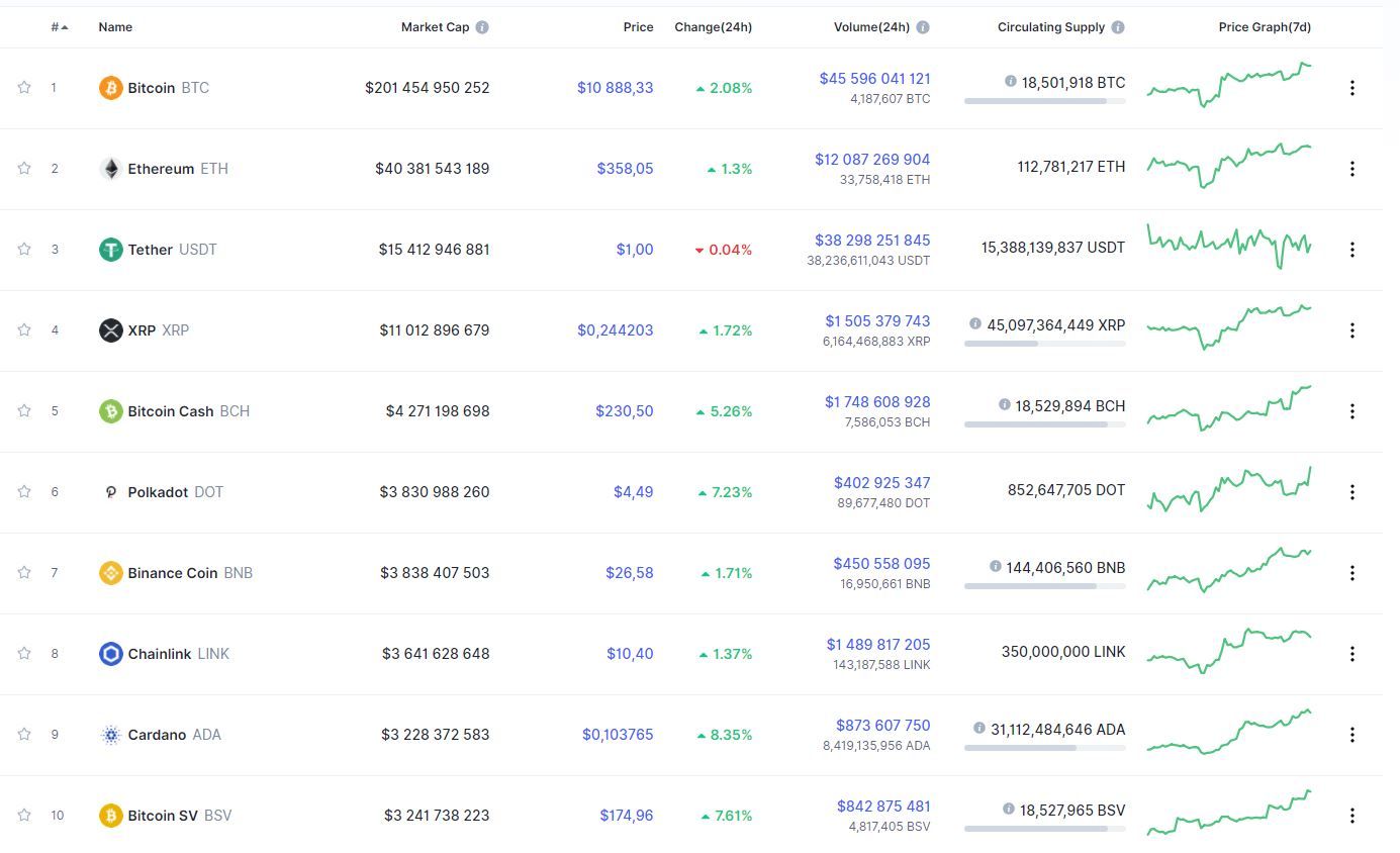 Биткоин (BTC) в понедельник продемонстрировал рост – криптовалюта вновь приблизилась к уровню $11 тыс. По состоянию на момент написания новости, монета торгуется по $10 888 (+2.08% к стоимости за 24 часа). Лучший результат позитивного движения за сутки при этом зафиксирован у Cardano (+8.35) и Polkadot (+7.23).