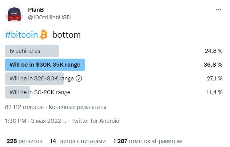 Большинство криптоинвесторов считает, что локальный минимум биткоина, который в криптосообществе принято называть «дном», расположен в диапазоне $30-35 тыс. На это указывают результаты опроса, который провел популярный в криптоиндустрии аналитик PlanB