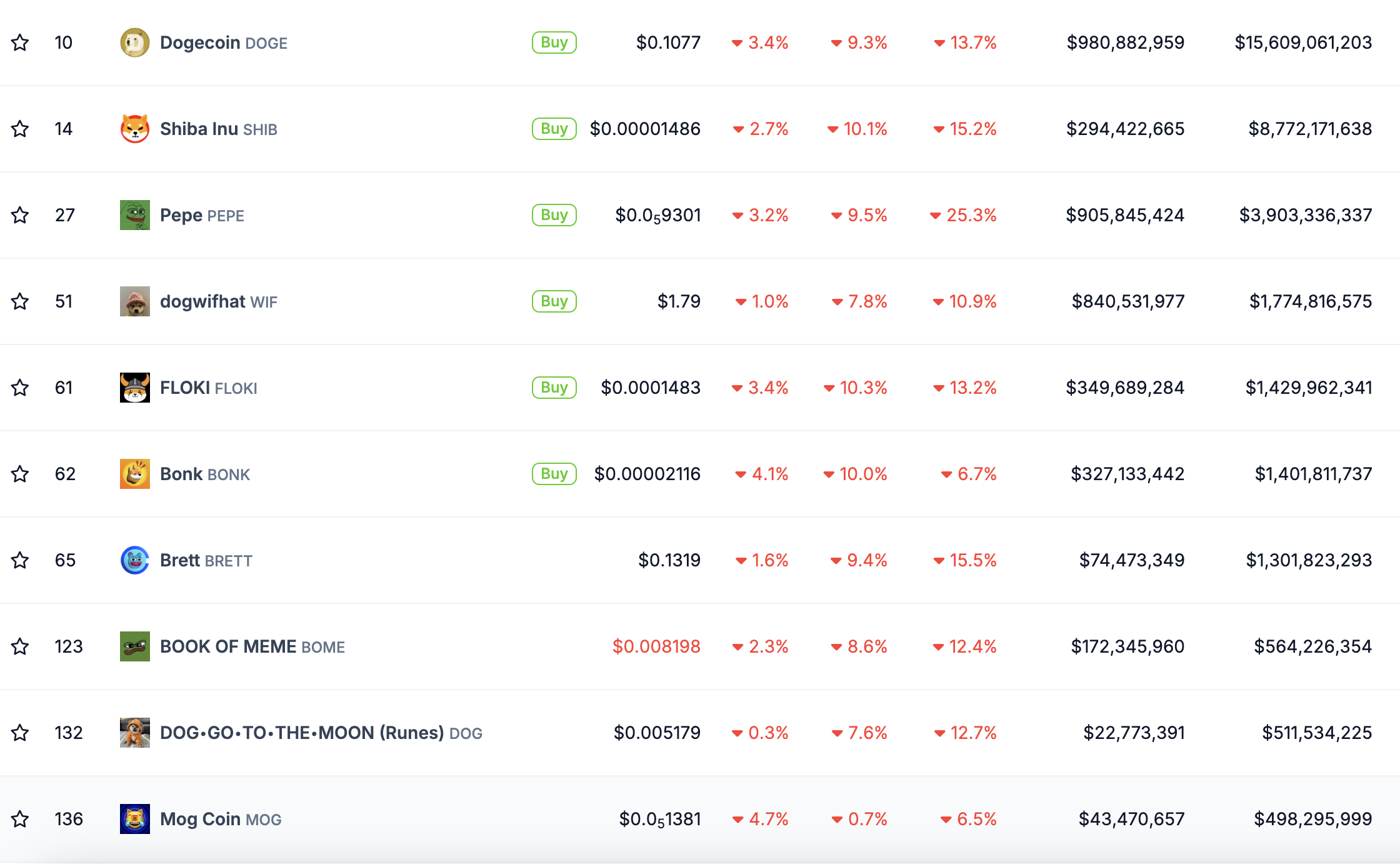 По данным CoinGecko, за последние сутки капитализация сектора мемкоинов снизилась на 15,5% до $43,5 млрд. Самое значительное падение из монет, входящих в топ-10, испытал токен FLOKI. За прошедшие 24 часа его курс обвалился на 10,3%.