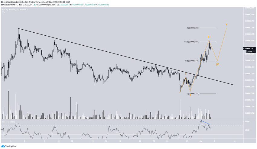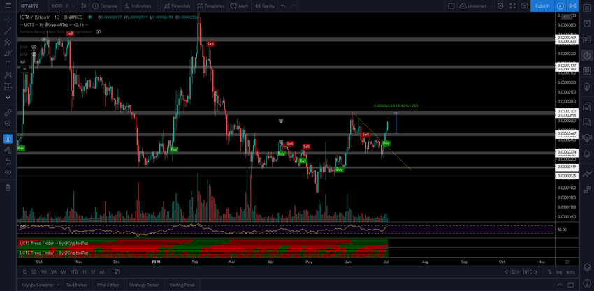 IOTA растет с 27 июня, когда изначально котировки упали к поддержке 2220 сатоши. Два дня спустя цена сформировала бычий молот и на следующий день пробила линию нисходящей поддержки, а также 50-дневную скользящую среднюю. С тех пор темпы роста ускорились, а торговые обороты повысились.