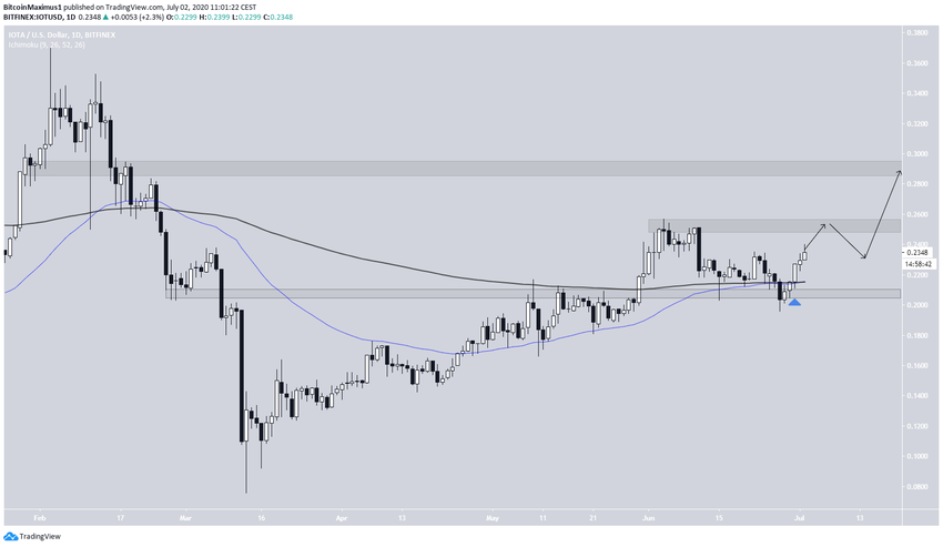 Аналогичным образом, пара IOTA/USD торгуется с повышением на протяжении последних пяти дней. Цена отскочила от поддержки $0.207, а затем превысила 50- и 200-дневные скользящие средние, которые сформировали бычье пересечение. Зачастую такое поведение говорит о начале восходящего тренда.