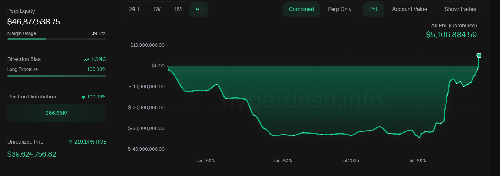 Трейдеру AguilaTrades удалось отыграть потерю $35 млн и выйти в профит на $5 млн. Первые потери участник рынка зафиксировал в конце весны 2025. Пик пришелся на период с июня по начало июля. В середине второго летнего месяца благодаря ряду инвестиционных решений AguilaTrades удалось покрыть все убытки и выйти в профит.